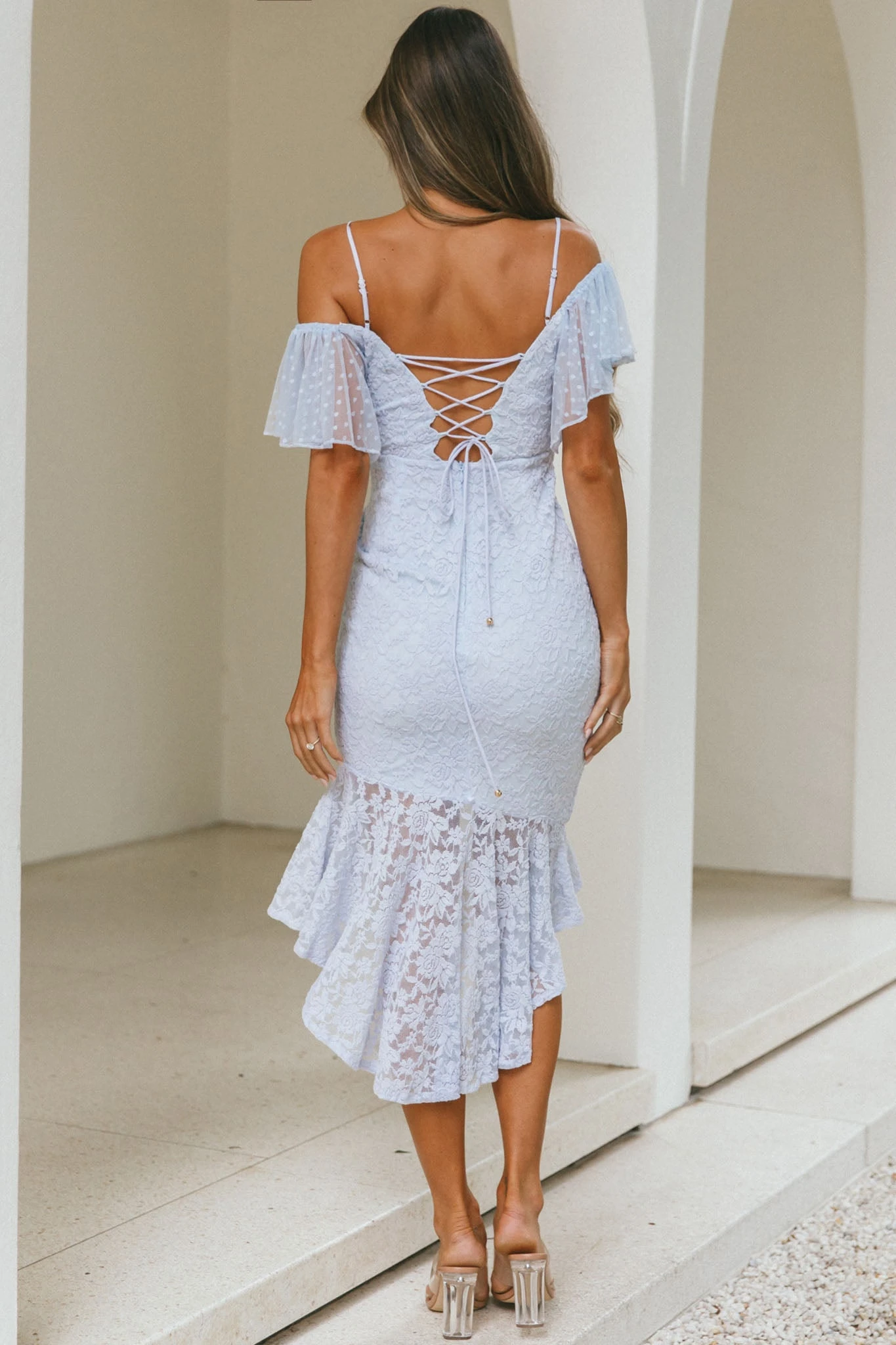 You will steal the show in our gorgeous Maribel midi dress. We are obsessed with its hail spot mesh sleeves and lace-up back feature. Perfect for a wedding or special occasion teamed with nude heels and a chic clutch.