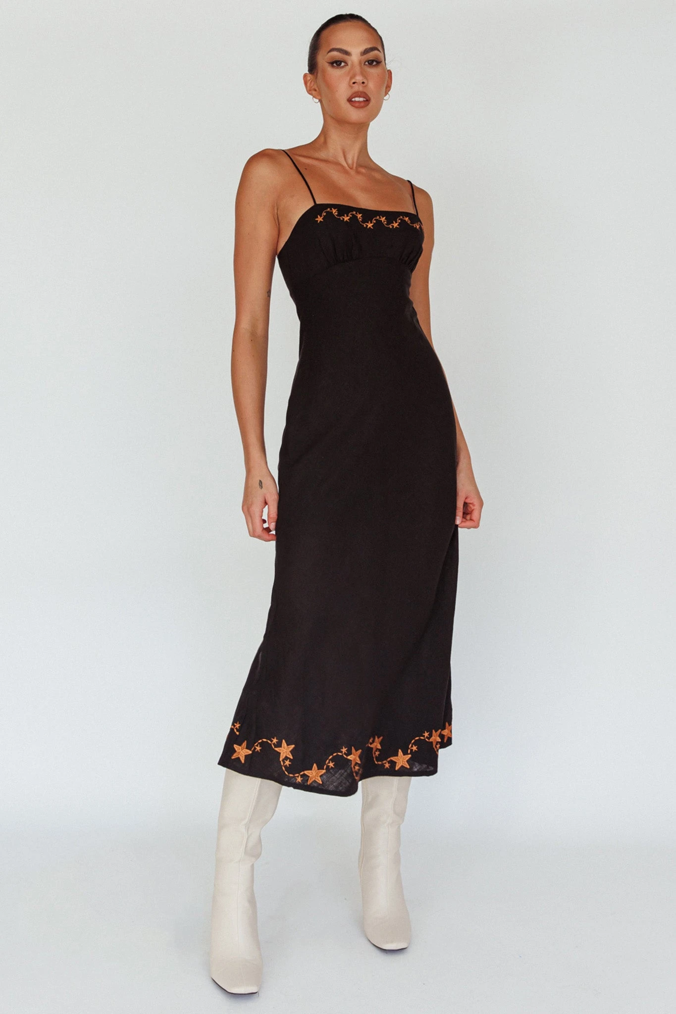 Our Star Garden midi dress is giving us all the 90’s vibes and we are here for it. Featuring a classic, square neckline and embroidery detail, it’s perfect for a date night with your lover. Team it with strappy, block heels and a tote to complete the look.